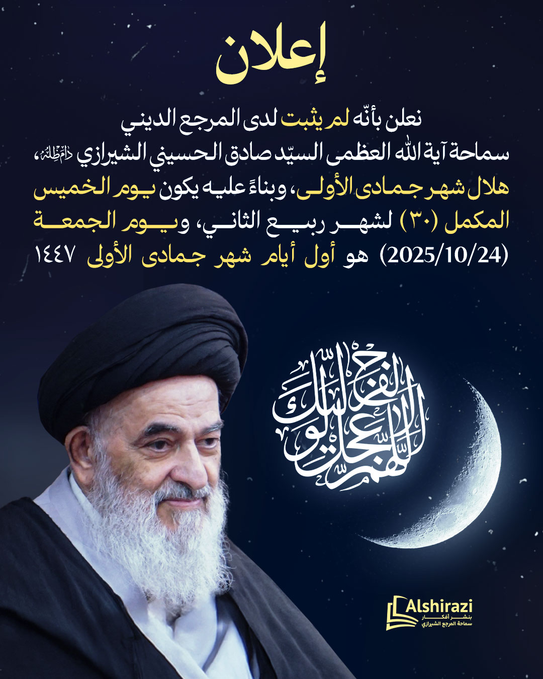 نعلن بأنّه لم يثبت لدى المرجع الديني سماحة آية الله العظمى السيّد صادق الحسيني الشيرازي دام ظله، هلال شهر جمادى الأولى، وبناءً عليه يكون يوم الخميس المكمل (30) لشهر ربيع الثاني، ويوم الجمعة (2025/10/24) هو أول أيام شهر جمادى الأولى 1447 للهجرة