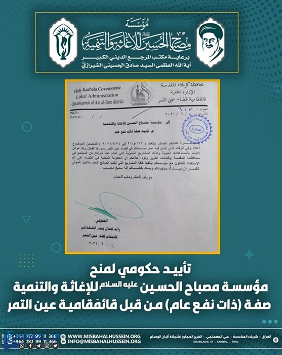 عنوان فوق الذکر توسط بخشداری بخش عین التمر در استان مقدس کربلا، با نامه ای رسمی خطاب به مؤسسه مصباح الحسین علیه السلام از طرف بخشداری مذکور و با امضای بخشدار، رائد فضال بندر المشهدانی، اخیراً در تاریخ 20/6/2021 اعطا گردید.