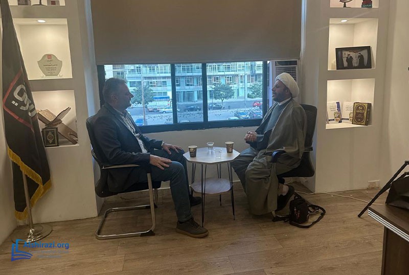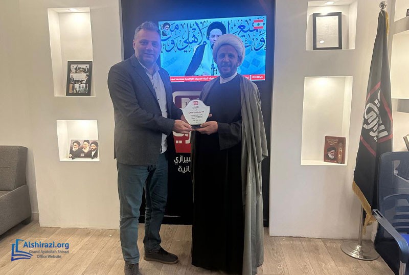 Hussein Al-Shaer, the director of the Al-Wai Al-Shirazi Satellite Network office in the city of Beirut, Lebanon, hosted Sheikh Ahmad Al-Ahmar at the network’s office in central Beirut. In this visit, Sheikh Al-Ahmar presented a plaque of appreciation to Mr. Al-Shaer on behalf of the Sayyid Al-Awsiyah Assembly, peace be upon them, and the Qamar Al-Ashirah Husseiniyah, peace be upon them, in Ayat Baalbek.