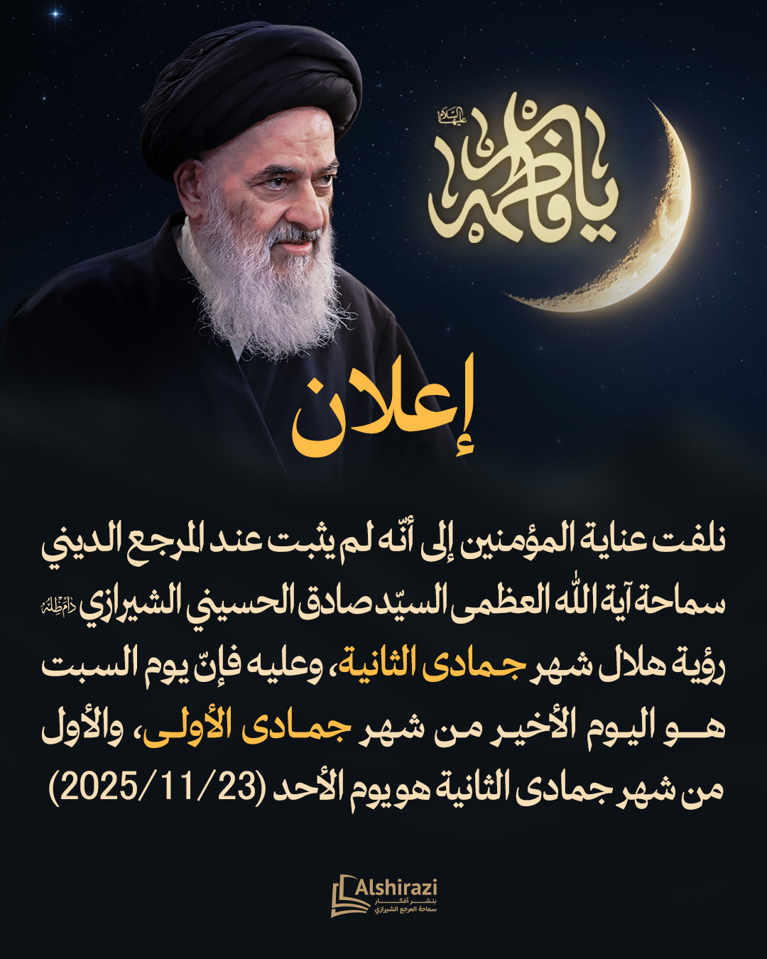 نلفت عناية المؤمنين إلى أنّه لم يثبت عند المرجع الديني سماحة آية الله العظمى السيّد صادق الحسيني الشيرازي دام ظله، رؤية هلال شهر جمادى الثانية، وعليه فإنّ يوم السبت هو اليوم الأخير من شهر جمادى الأولى، والأول من شهر جمادى الثانية هو يوم الأحد (2025/11/23)