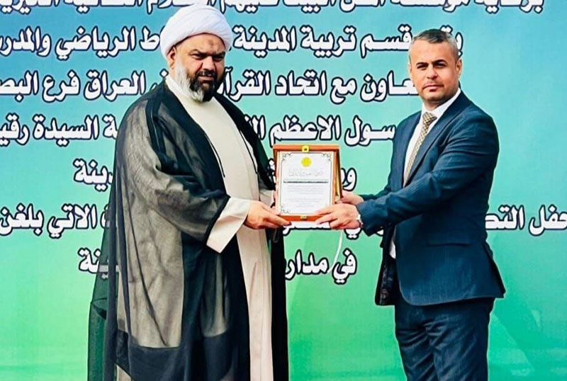این آیین با حضور جمعی از علما، شیوخ عشایر، دانشگاهیان و شخصیت های علمی برگزار شد و در پایان، موسسه اهل بیت علیهم السلام با اهدای لوح افتخار و خلاقیت، از مدیر آموزش و پرورش شهرستان المدینه و اتحادیه قرآنیان تجلیل کرد.