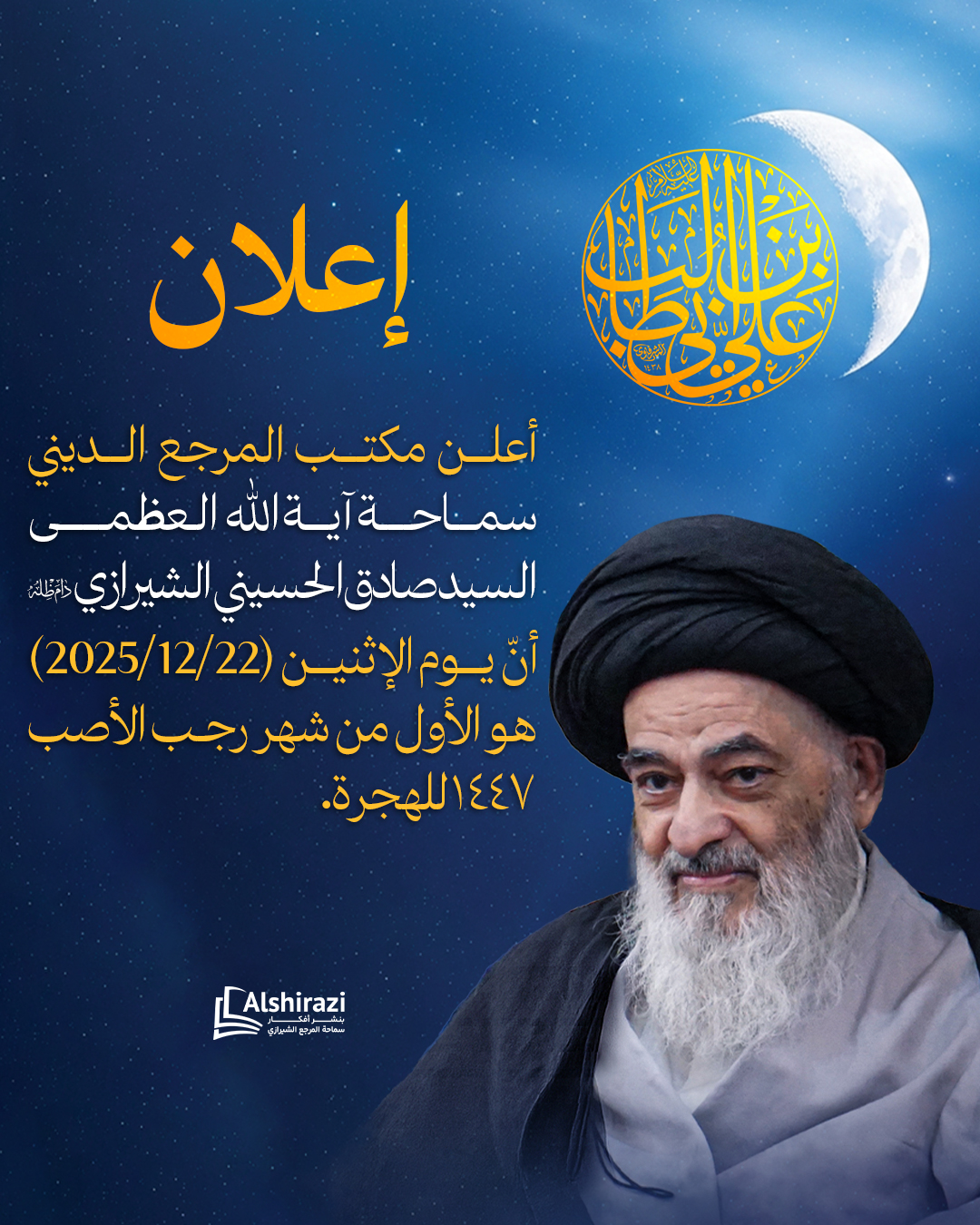 أعلن مكتب المرجع الديني سماحة آية الله العظمى السيد صادق الحسيني الشيرازي دام ظله أنّ يوم الإثنين (2025/12/22) هو الأول من شهر رجب الأصب ١٤٤٧ للهجرة.
