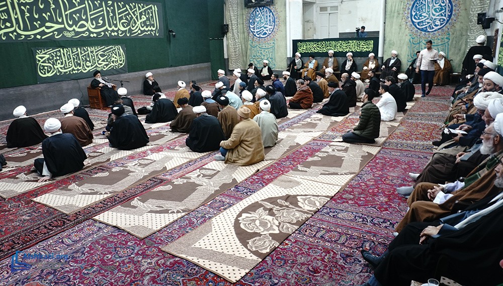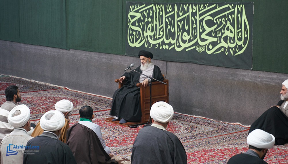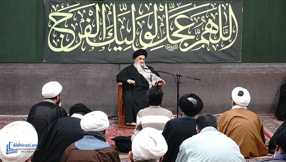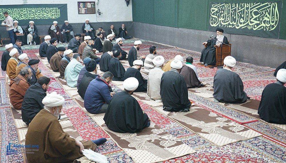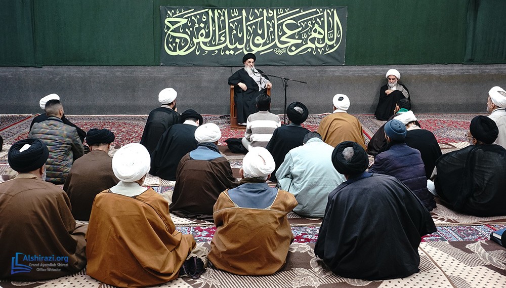 On Monday, 8 Rajab 1447 AH (December 29, 2025), another scholarly session of the esteemed Religious Authority, Grand Ayatollah Sayyid Sadiq Husseini Shirazi, may Allah prolong his life, was held at his residence in the Holy City of Qom, with the participation of dozens of scholars, religious figures, and seminary students.