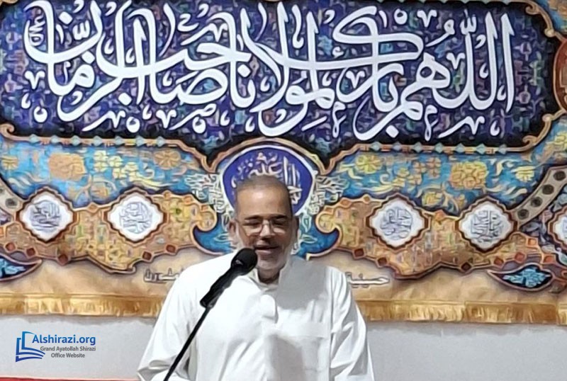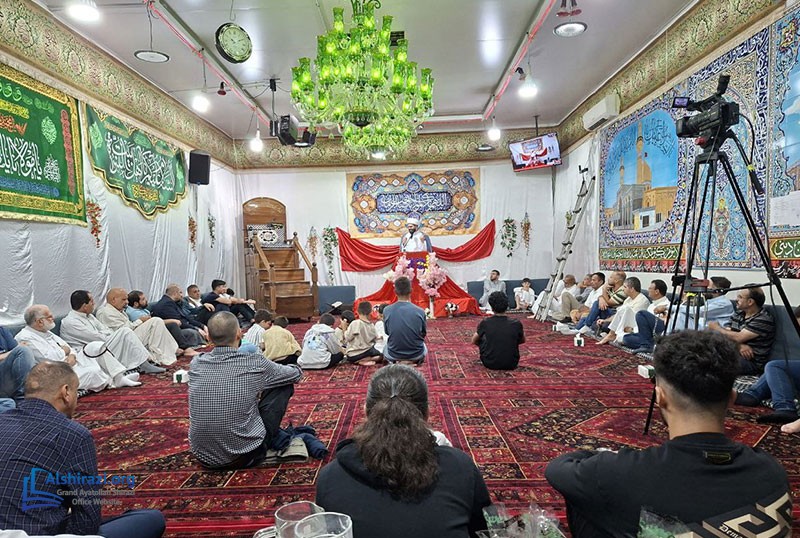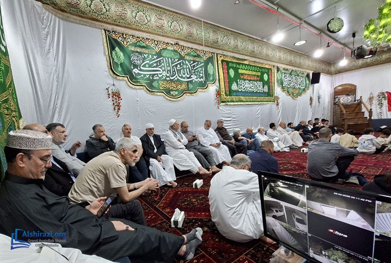 The program began with the congregational Maghrib and Isha prayers, followed by the recitation of Ziyarat Ale Yaseen. The ceremony then continued with a variety of cultural and spiritual programs, including an English lecture by Sheikh Mohammad Hourani, Persian devotional chanting by Seyyed Ali Waqefi, a lecture by Seyyed Ali Razawi, and the recitation of religious poetry by Abu Ahmad Najafi.