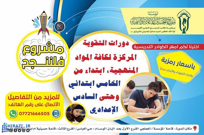 با توجه به نزدیکی فصل امتحانات میانسال که اخیراً توسط اداره آموزش و پرورش کشور عراق اعلام شد، مؤسسه فرهنگی ـ نیکوکاری مصباح الحسین علیه السلام، از مراکز تحت اشراف دفتر مرجع عالیقدر آیت الله العظمی سید صادق حسینی شیرازی در کربلای معلی از برگزاری دوره کمک آموزشی برای دانش آموزان این شهر خبر داد.