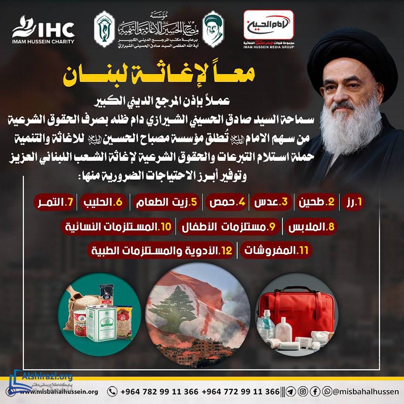 با مجوز مرجع عالیقدر آیت الله العظمی سید صادق حسینی شیرازی دام ظله مؤسسه فرهنگی و نیکوکاری مصباح الحسین علیهالسلام در کربلای معلی (تحت اشراف دفتر مرجعیت) پویش بزرگ کمک رسانی به مردم آسیب دیده لبنان را آغاز کرده است.