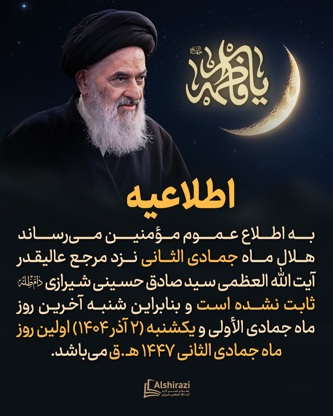 به اطلاع عموم مؤمنين میرساند هلال ماه جمادی الثانی نزد مرجع عالیقدر آیت الله العظمی سید صادق حسینی شیرازی دام ظله ثابت نشده است و بنابراین شنبه آخرین روز ماه جمادى الأولى و یکشنبه (۲ آذر ۱۴۰۴) اولین روز ماه جمادی الثانی ۱۴۴۷ هجری قمری میباشد.