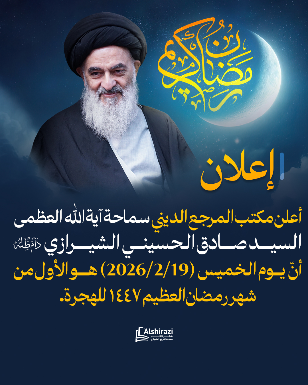 أعلن مكتب المرجع الديني سماحة آية الله العظمى السيد صادق الحسيني الشيرازي دام ظله أنّ يوم الخميس (2026/2/19) هو الأول من شهر رمضان العظیم ١٤٤٧ للهجرة.